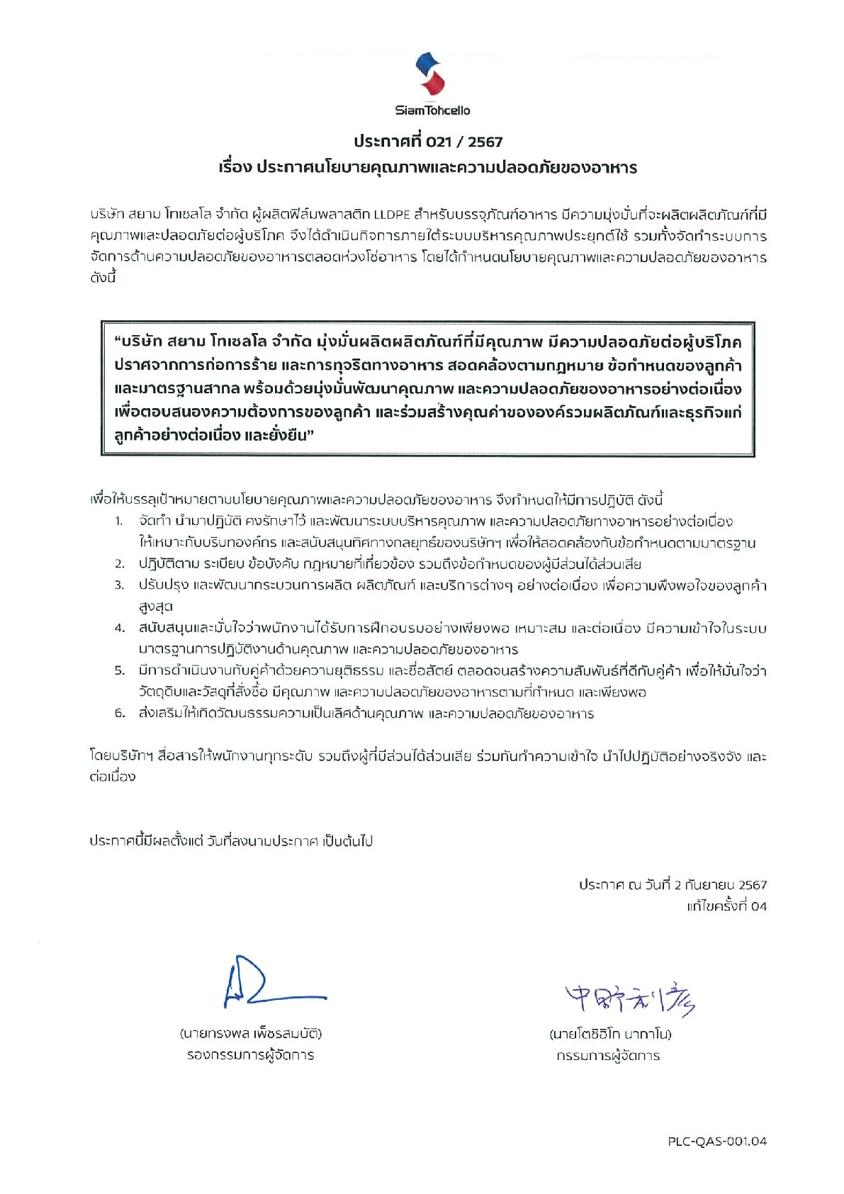 เราจะมุ่งมั่นที่จะผลิตฟิล์มให้มีคุณภาพสูง, ส่งมอบตรงเวลา เพื่อตอบสนองความต้องการของลูกค้าอย่างรวดเร็วตลอดจน เพิ่มศักยภาพของบุคลากรในองค์กร สร้างสรรค์นวัตกรรมใหม่ ให้เติบโตร่วมกันอย่างยั่งยืน